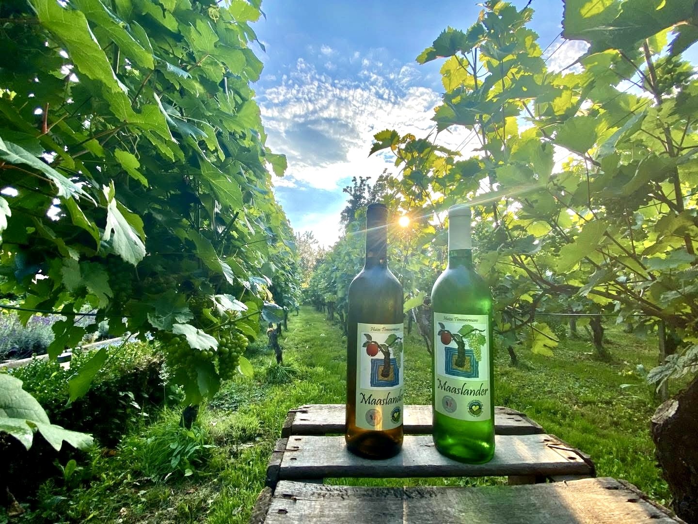 Onze Maaslander, bekroond en officieel erkend als traditioneel Vlaams streekproduct door VLAM, brengt druiven en appels harmonieus samen tot een frisse, karaktervolle wijn.